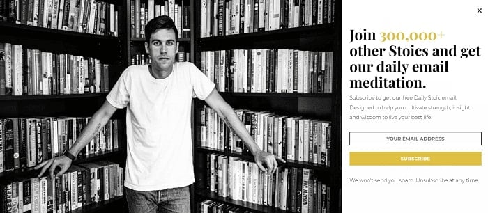 Daily Stoic is a website that teaches Stoic philosophy and how to use it for modern challenges. This landing page aims to get visitors to join their mailing list.