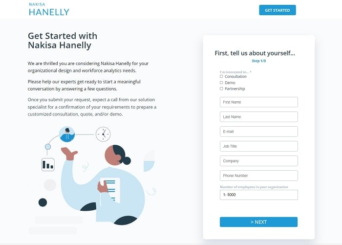 Nakisa Hanelly is a company that offers solutions to help companies organize and improve their operations. This landing page aims to get visitors to sign up for a demo of their software.