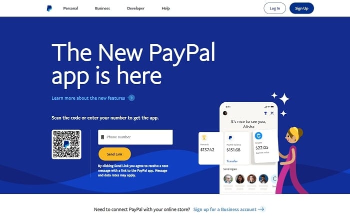Paypal is an app for sending and receiving money. This landing page aims to get visitors to download and sign up.