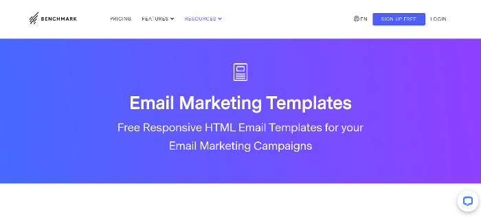 Benchmark houses 54 free, responsive HTML email templates. It has a drag-and-drop email builder, HTML editor, photo editor, and customizable color schemes.