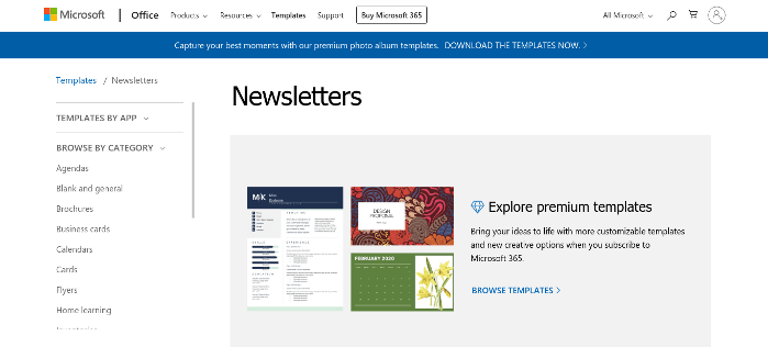 Microsoft Office hosts 20 downloadable, free newsletter templates. Access to premium templates requires a paid subscription to Microsoft 365.