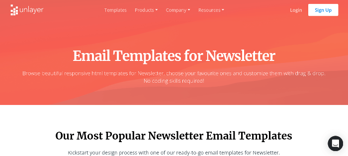 Unlayer is a free drag-and-drop email and landing page editor. It has over 1,000 responsive HTML email newsletter templates and free stock photos. You can also customize the HTML code of your emails instead of using a template.