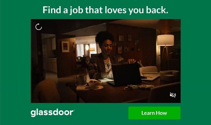 This video ad shows multiple images telling the story of this woman as she navigates finding the right job. The video attracts attention. But the straight-to-the-heart “find a job that loves you back” message calls out to weary employees. A flexible ad format that works for Facebook ads or websites.