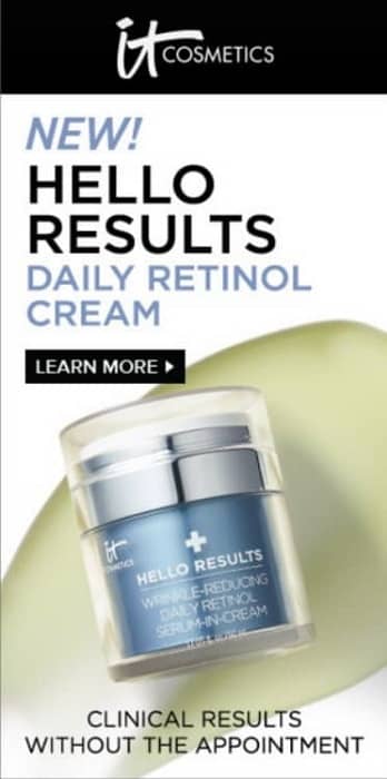 It Cosmetics have upped the amperage with an enormous bright product image, a captivating product name, huge text, and a hard-to-resist promise. Every part of this ad pulls its weight to get your click.