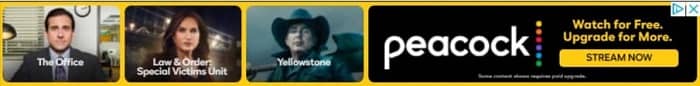 Peacock’s small banner ad uses bright text colors and popular TV show images to grab your attention. The free offer keeps you reading and makes you curious. The yellow button gives you a crystal-clear next step.